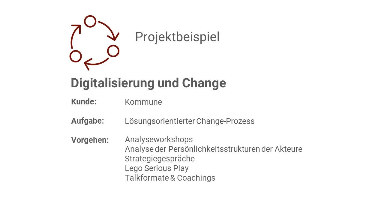 Wir unterstützen die Strukturierung Ihrer Transformation, moderieren den Prozess und geben Ihnen und Ihren Akteuren die Tools und die Methoden für Ihren Erfolg.